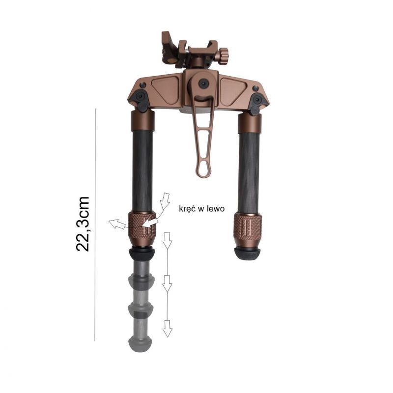 Bipod wyposażony jest w dwustopniową regulację rozstawu nóg, z blokadą stożkową – system ten gwarantuje solidne trzymanie pozycji i całkowity brak luzów.