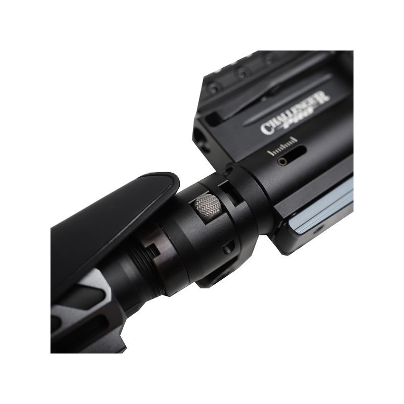 Wiatrówka Challenger Pro została wyposażona w szyna weaver standardu 22 mm, dzięki której możemy zamontować lunetę lub kolimator, który umożliwi oddawanie szybkich celnych strzałów. Dodatkowo dolna szyna akcesoryjna została wydłużona co umożliwia montaż bipodu, statywu, tripodu, oraz innych elementów, które będą pozwalać na urozmaicenie strzelectwa oraz komfort pracy.