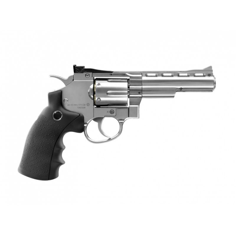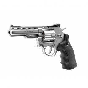 Rewolwer pneumatyczny bardzo wysokiej jakości wykonania, całkowicie metalowy, wykończony gładkim niklowanym pokryciem. Oferujemy trzy możliwe wersje wiatrówki z różną długością lufy - S25 (2,5 cala), S40 (4 cale) i S60 (6 cali).
