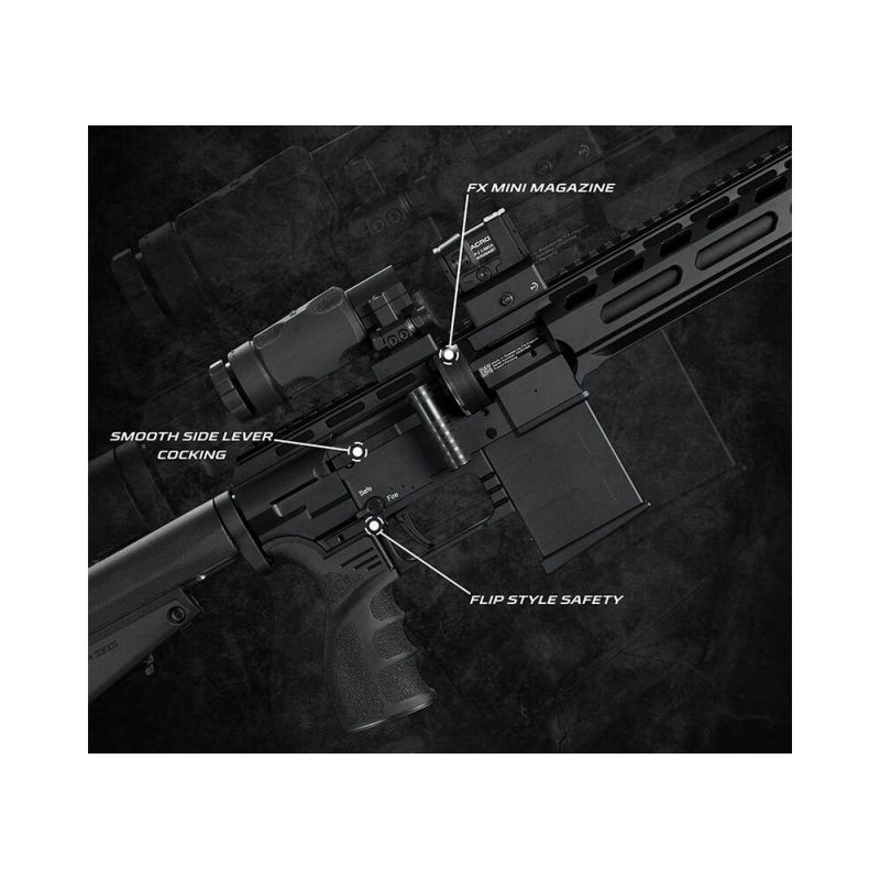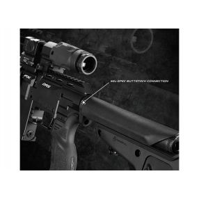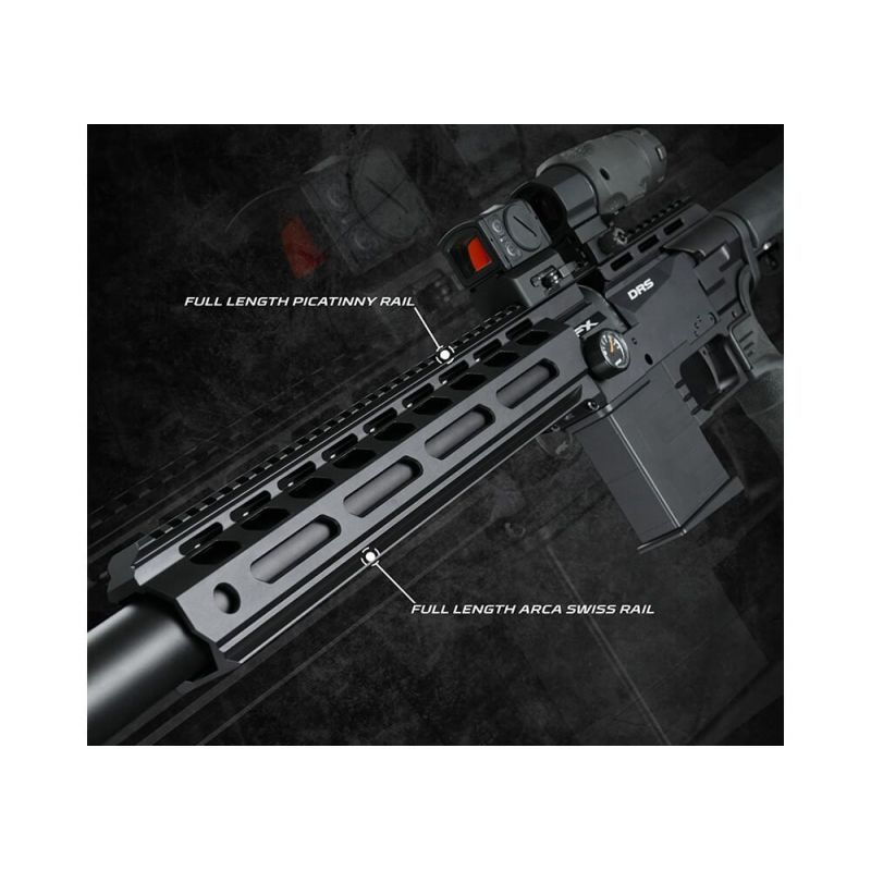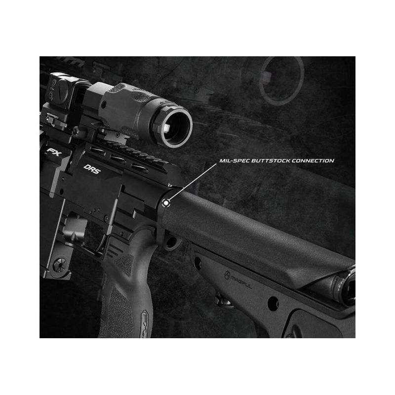 Kolejną rzucającą się w oczy cechą FX DRS Tactical 700 jest możliwość montażu kolby typu AR15 z prowadnicą Mil-Spec. Nie są one dołączone do zestawu, ponieważ często zależą od indywidualnych preferencji. W tym celu w naszym sklepie oferujemy szeroki asortyment prowadnic i kolb. Jednakże FX DRS Tactical 700 można używać bez nich. Standardowo wyposażony w chwyt FX UG-1 pozwala na używanie go jako wiatrówki PCP.