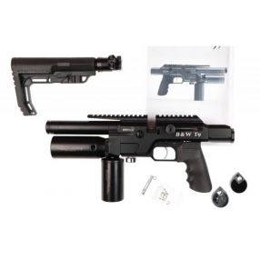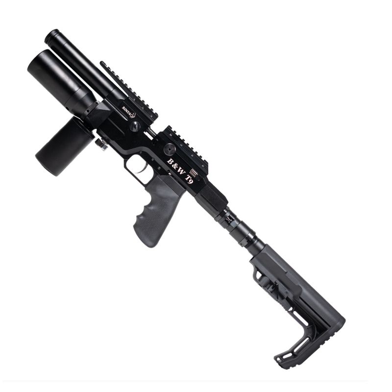 BinTac T‑9 to półautomatyczny, kompaktowy karabinek PCP w kalibrze .35 (9 mm), który łączy krótką, poręczną konstrukcję z wysoką energią wylotową sięgającą około 135 J. Model zaprojektowano z myślą o użytkownikach oczekujących szybkiej kolejności oddań i dużej mocy w łatwym do przenoszenia formacie; po złożeniu kolby całkowita długość zmniejsza się do około 42 cm, a lufa ma długość około 203 mm, co daje znakomitą kompaktowość bez kompromisu w osiągach.