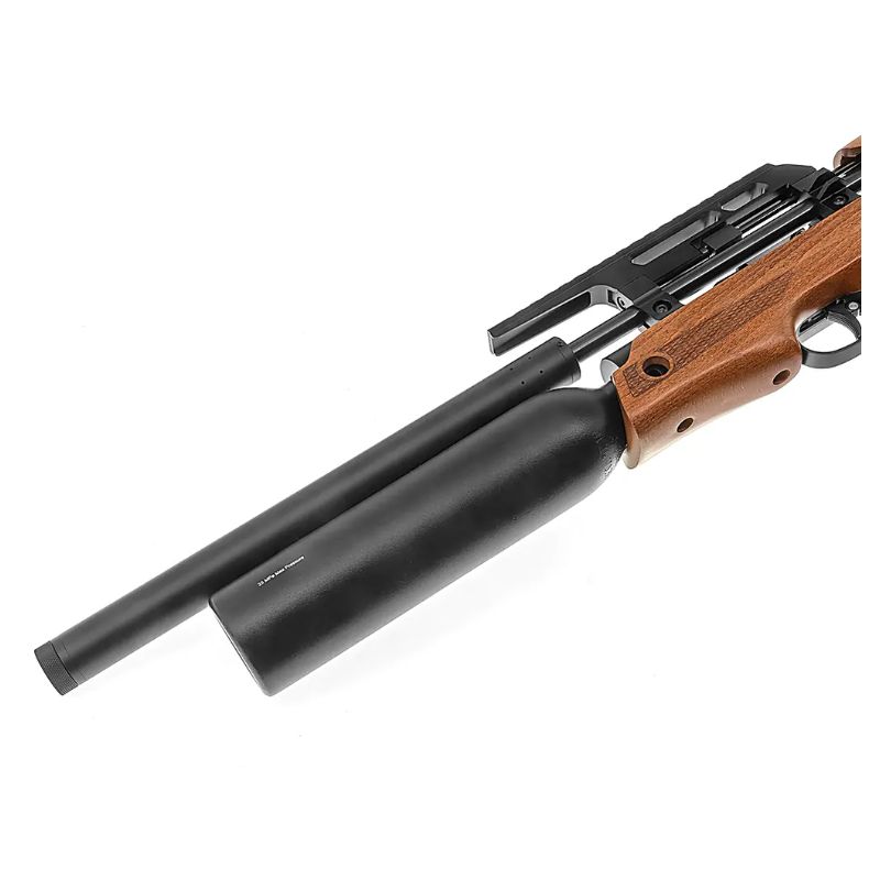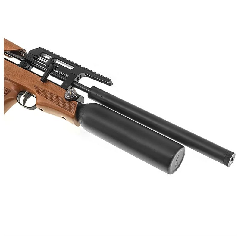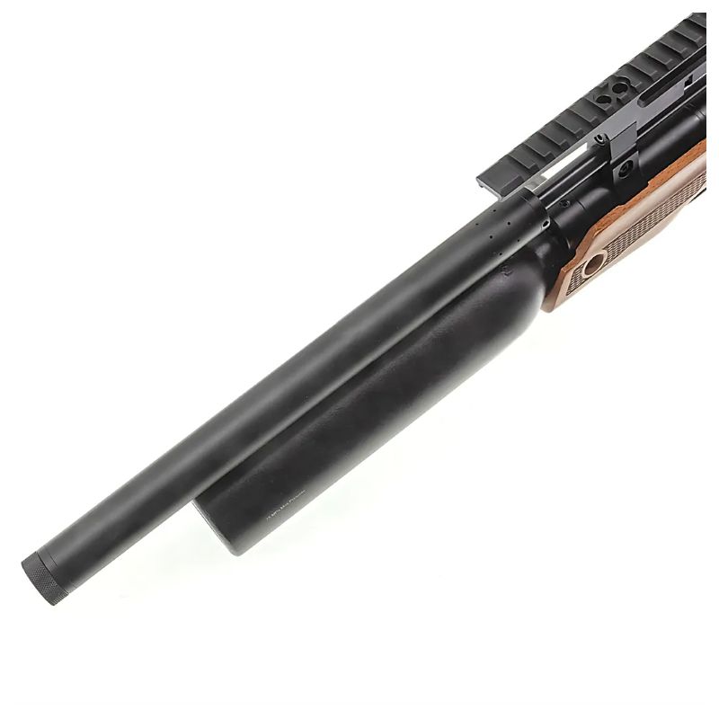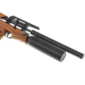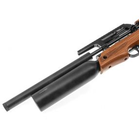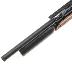 Na końcu lufy znajduje się tłumik, który skutecznie ogranicza hałas – strzał staje się bardziej „miękki” i mniej uciążliwy dla otoczenia.